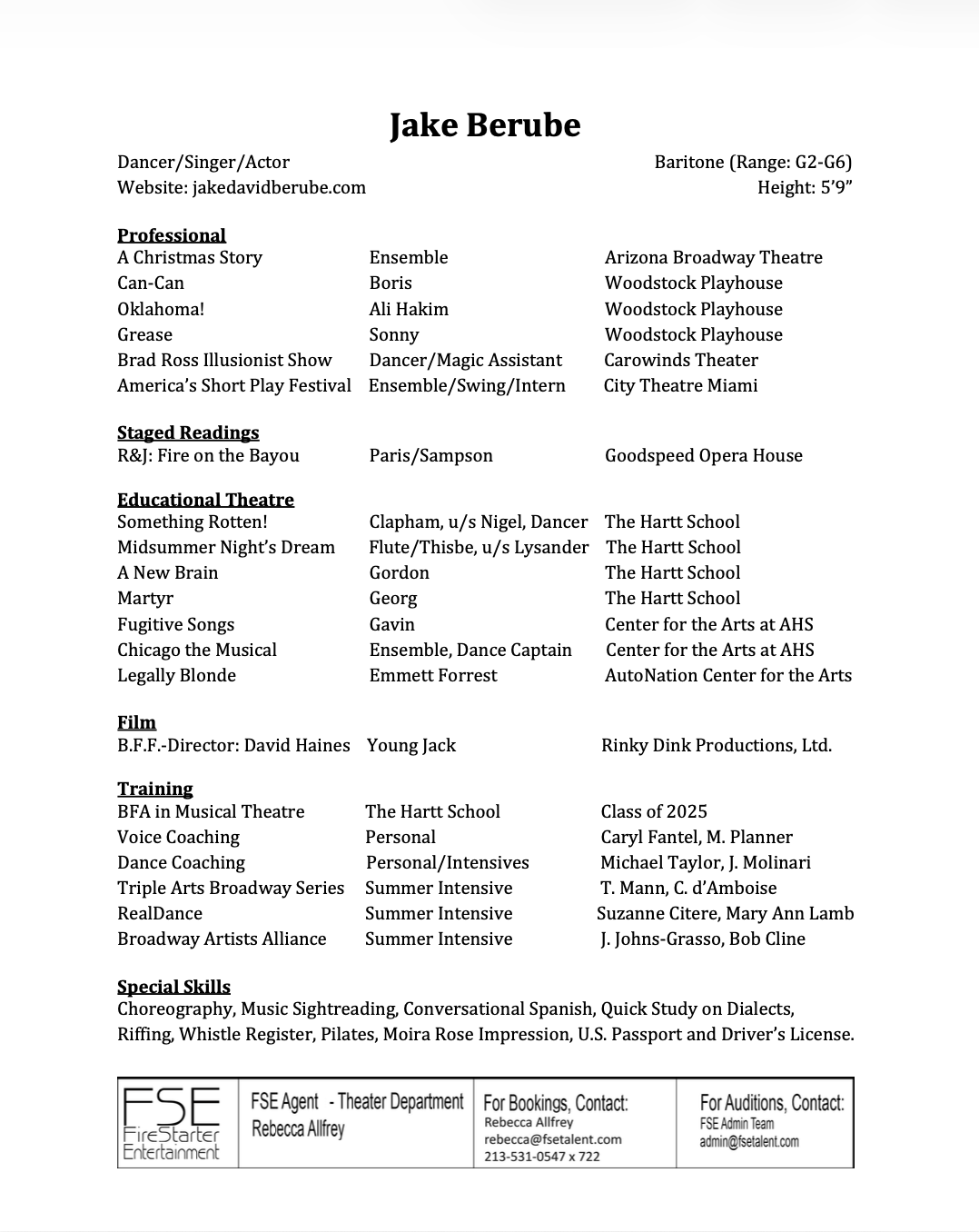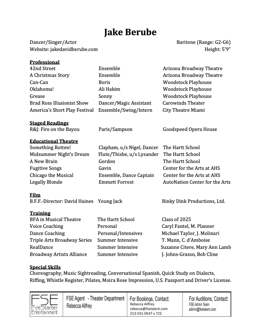 As a dancer, singer, and actor who can work locally in NYC, Miami, and LA, I am looking to continue my professional career on stage and screen. Whether it’s a dramatic scene that calls for vulnerability or a comedic role that brings quite a chuckle, I strive to bring authenticity, heart, and joy to every performance.